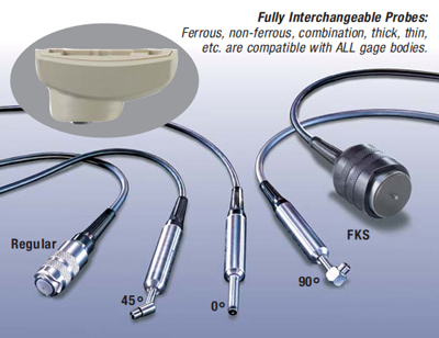 從各種測量范圍和探頭樣式選擇的PosiTector 6000量具的身體和一個探頭。提供多種選擇的互換探頭。