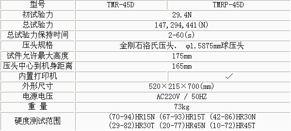 產(chǎn)品概述: TMR-45D電動(dòng)表面洛氏硬度計(jì)電動(dòng)表面洛氏硬度計(jì)采用自動(dòng)加卸試驗(yàn)力機(jī)構(gòu),金屬洛氏硬度計(jì),試驗(yàn)力變換由變荷手輪的旋轉(zhuǎn)而獲得,操作簡(jiǎn)便迅速,維氏硬度計(jì),除表盤對(duì)零外,洛氏硬度計(jì)的使用,沒有人為的操作誤差,具有很高的靈敏度、穩(wěn)定性 功能特點(diǎn): TMRP-45D數(shù)顯表面洛氏硬度計(jì)是集機(jī)、電一體化的高新技術(shù)產(chǎn)品,可進(jìn)行表面洛氏硬度測(cè)試。該儀器造型新穎、美觀。直觀的LCD液晶屏顯示裝置,是普及型表面洛氏硬度計(jì)的升級(jí)換代產(chǎn)品。 該硬度計(jì)適用硬質(zhì)合金、滲碳鋼、淬火鋼、硬鑄鐵及軟鋼、鋁合金、銅合金和可鍛鑄鐵的硬度的測(cè)定。 技術(shù)參數(shù):
